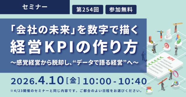 セミナー 「会社の未来」を数字で描く経営KPIの作り方 ~感覚経営から脱却し、“データで語る経営”へ~ 日時: 2026年4月10日(金)10:00~10:40