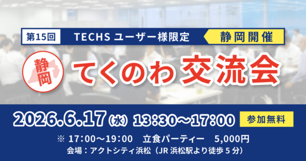 体験会・イベント 【第15回 静岡開催】TECHSユーザー企業様限定!現場のリアルがつながる、学びと交流の一日 「てくのわ交流会」 日時: 2026年6月17日(水)13:30~17:00