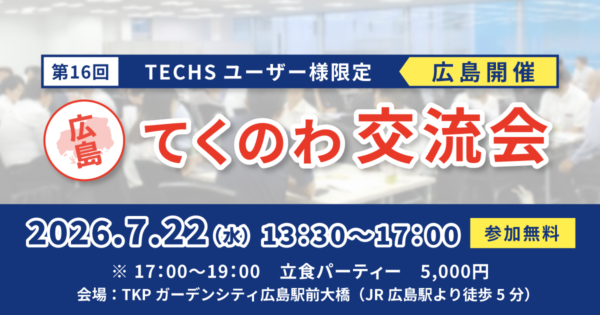 体験会・イベント 【第16回 広島開催】TECHSユーザー企業様限定!現場のリアルがつながる、学びと交流の一日 「てくのわ交流会」 日時: 2026年7月22日(水)13:30~17:00