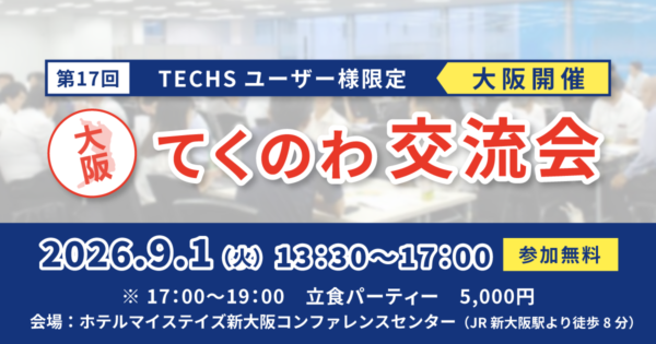 体験会・イベント 【第17回 大阪開催】TECHSユーザー企業様限定!現場のリアルがつながる、学びと交流の一日 「てくのわ交流会」 日時: 2026年9月1日(火)13:30~17:00