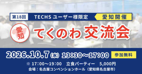 体験会・イベント 【第18回 愛知開催】TECHSユーザー企業様限定!現場のリアルがつながる、学びと交流の一日 「てくのわ交流会」 日時: 2026年10月7日(水)13:30~17:00