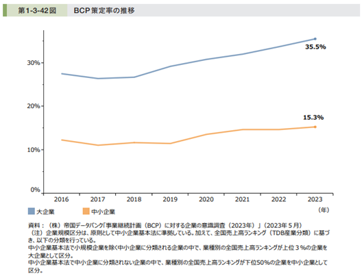 中小企業白書によると、BCPの策定率は大企業でも中小企業でも上昇傾向にあります。2023年の策定状況を見ると、大企業で35.5%、中小企業で15.3%になっています。