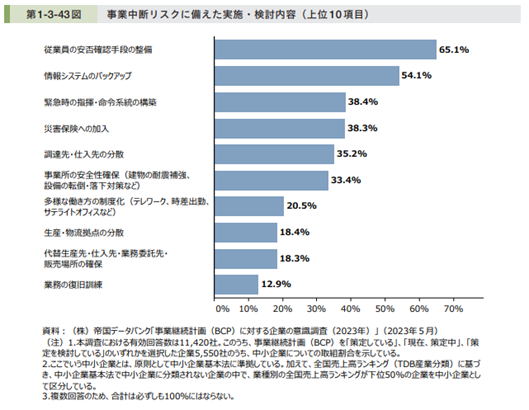 中小企業における事業中断リスクに備えた実施・検討内容では、「従業員の安否確認手段の整備」が最も高く、65.1%となっています。次いで、「情報システムのバックアップ」が54.1%、「緊急時の指揮・命令系統の構築」が38.4%と続いています。また、僅差で「災害保険への加入」「調達先・仕入先の分散」「事務所の安全性確保(建物の耐震性補強、設備の転倒・落下対策など)」がほぼ横並びとなっています。