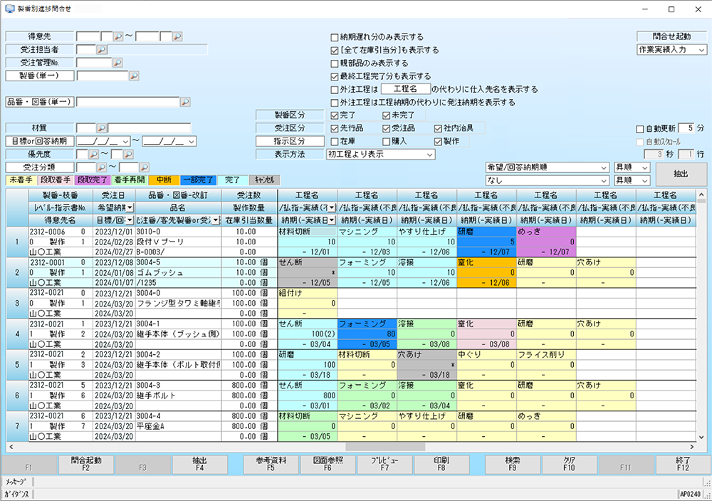 生産管理システム『TECHS-BK』:工程ごとの進捗確認画面イメージ(製番別進捗問合せ)