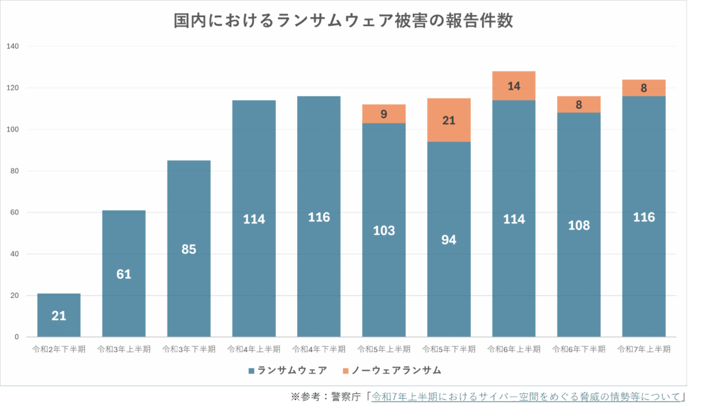 警察庁の調査によれば、2025年上半期のランサムウェア被害の約3分の2が中小企業でした。被害件数は2021年の146件から2024年には222件へと高水準で推移しており、依然として増加傾向にあります。独立行政法人情報処理推進機構(IPA)が発表する「情報セキュリティ10大脅威」では、3年連続で「ランサムウェアによる被害」が組織における脅威の第1位に選ばれています。