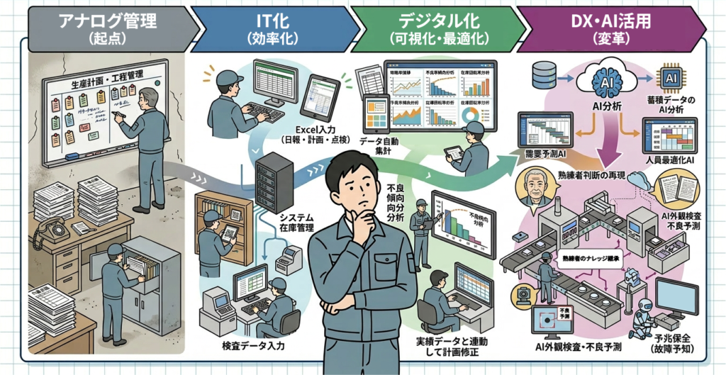 自社がどの段階にいるのかを正しく把握し、IT化・デジタル化・DX、そしてAI活用へと段階的に取り組むことが、これからの製造業に求められます。