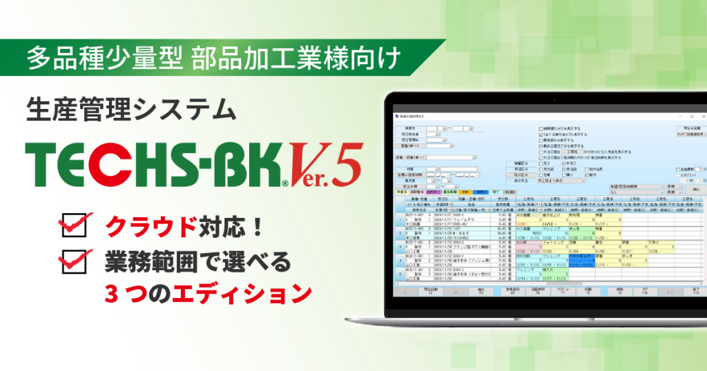 テクノアは、多品種少量生産の部品加工業様向け生産管理システム『TECHS-BK』の新バージョン(Ver.5.0)を2024年1月1日より発売します。