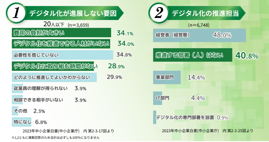 中小企業様のデジタル化推進に向けた課題は「費用負担が大きい」「デジタル化を推進できる人材がいない」などの経営資源の不足が要因ではないかと考えられています。特に、中小企業様ではデジタル化を推進する「デジタル人材」の育成に関するノウハウが少なく、難しいことが現状です。