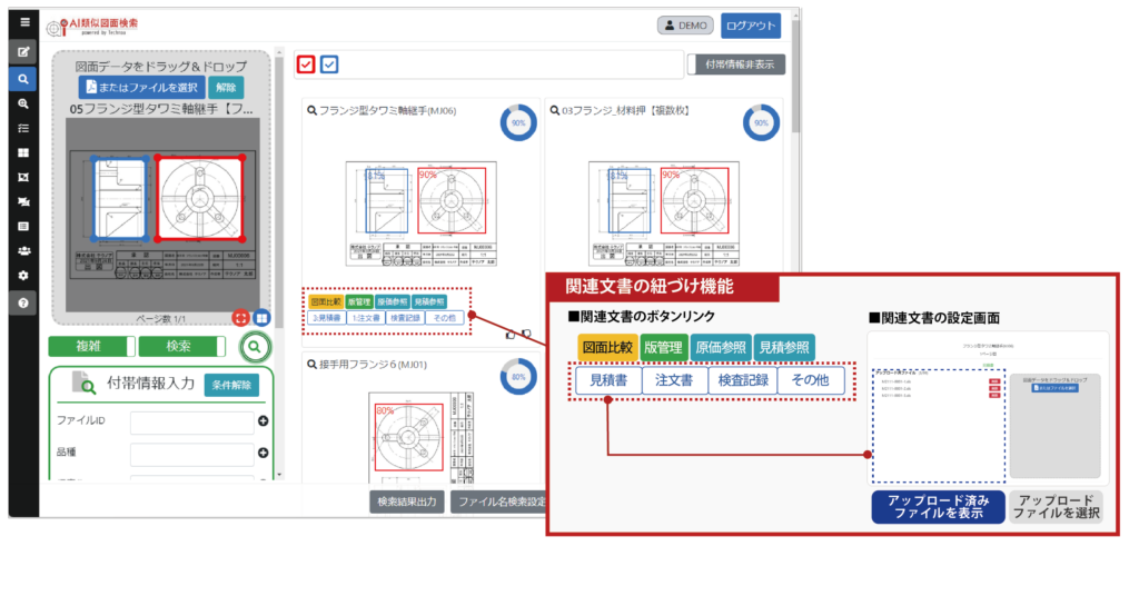 『AI類似図面検索』画面イメージ:関連文書の紐づけ機能
