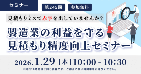 セミナー 見積もりミスで赤字を出していませんか? 製造業の利益を守る見積もり精度向上セミナー 日時: 2026年1月29日(木)10:00~10:30