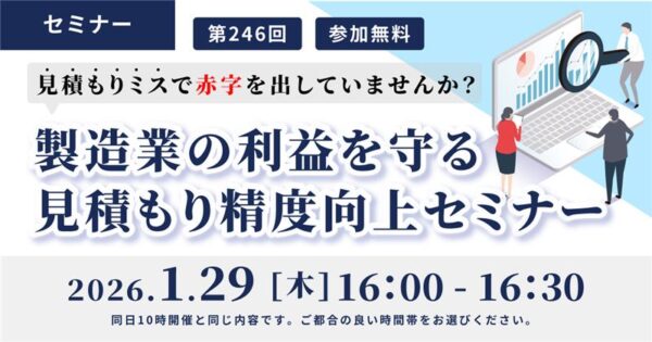 セミナー 見積もりミスで赤字を出していませんか? 製造業の利益を守る見積もり精度向上セミナー 日時: 2026年1月29日(木)16:00~16:30